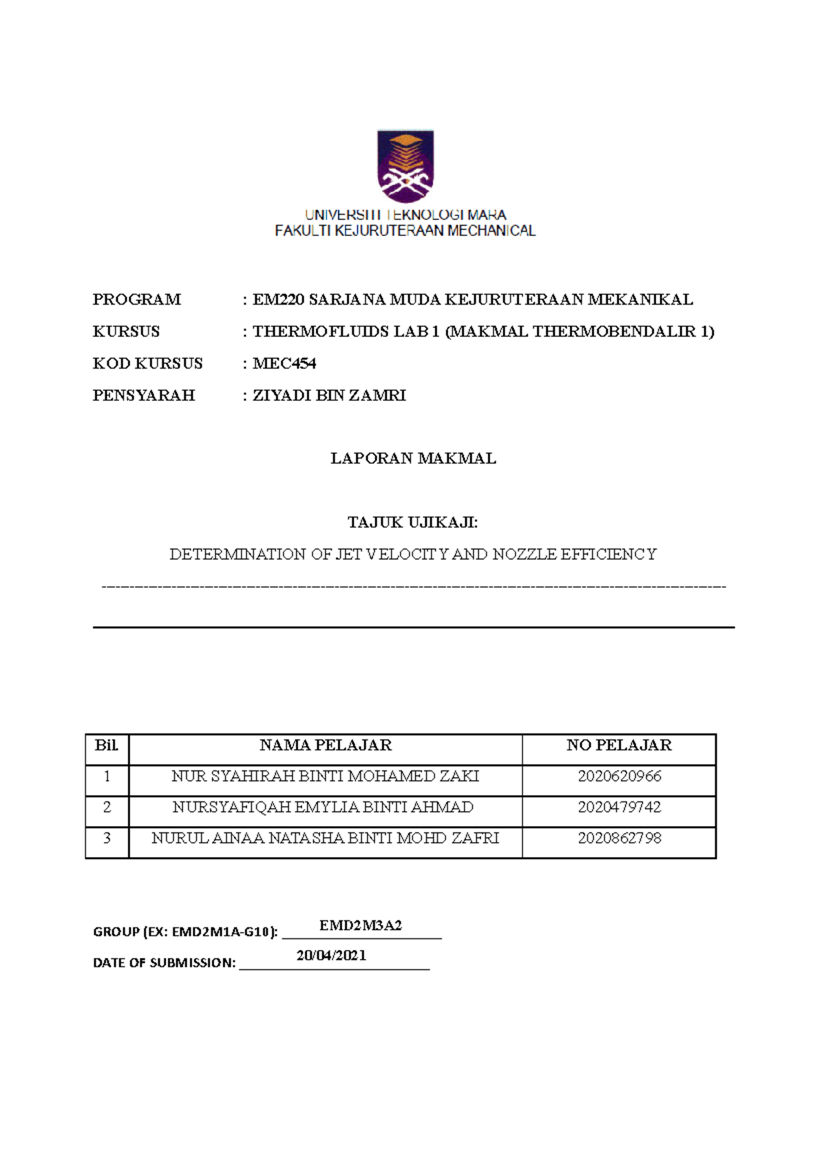 Determination Of Jet Velocity And Efficiency Program Em220 Sarjana Muda Kejuruteraan Mekanikal Studocu
